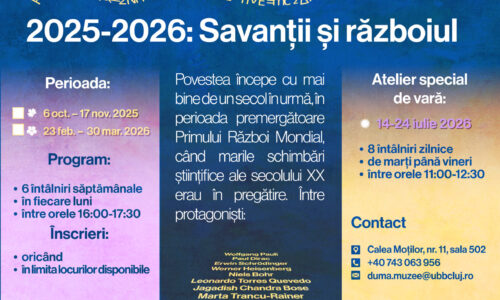 Muzeul Alexandru Duma anunță lansarea înscrierilor pentru cele trei „Ateliere de gândire critică” pe care le organizează în anul universitar 2025-2026 sub titlul „Savanții și războiul”. Perioadele de desfășurare sunt următoarele: – 6 oct. – 17 nov. 2025 – 23 feb. – 30 mar. …
