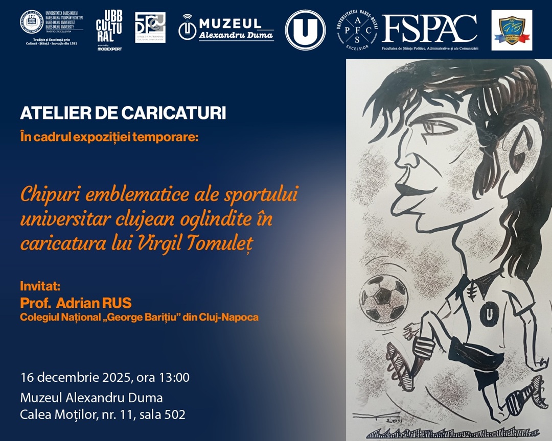 Muzeul Alexandru Duma din cadrul Direcției Patrimoniu Cultural Universitar a Universității Babeș-Bolyai din Cluj-Napoca organizează un atelier de caricaturi în ambianța inspiratoare a expoziției temporare pe care o găzduiește în prezent: „Chipuri emblematice ale sportului universitar clujean oglindite în caricatura lui Virgil Tomuleț”.