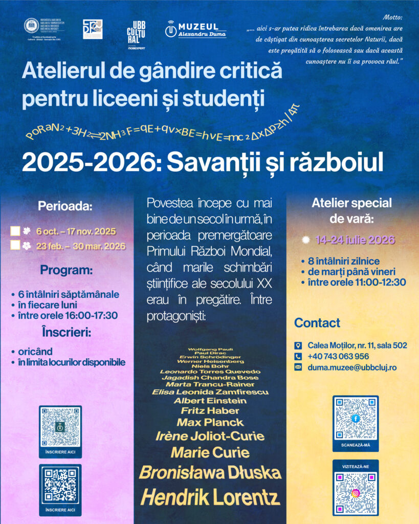 Muzeul Alexandru Duma anunță lansarea înscrierilor pentru cele trei „Ateliere de gândire critică” pe care le organizează în anul universitar 2025-2026 sub titlul „Savanții și războiul”. Perioadele de desfășurare sunt următoarele: